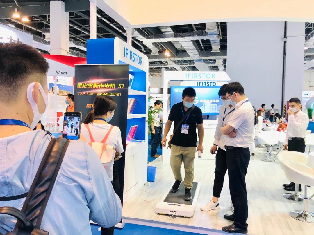 (參觀者在體驗(yàn)SMC走步機(jī),并與富利德工作人員交流探討)